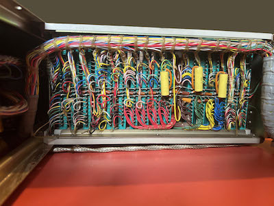 The left half of the hand-wired card-cage backplane.