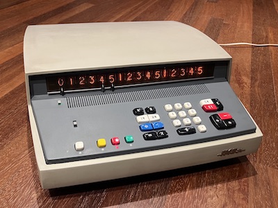 1969 Logic Technology: SSI Memory Technology: DELAY-MS Display: NIX This model uses a magnetostrictive delay-line for memory, with a novel technique employed for register management. There are two write transducers on the delay-line at different positions, making a short loop and a long loop. One of the registers cycles on the short loop while the others cycle on the long loop. The register bits on the long loop are injected with an empty bit-slot between them. When they reach the short-loop section of the delay line, the bits of the short-loop register are interleaved with those of a long-loop register by injecting them into the empty bit-slots. This makes it possible to vary which long-loop register will be involved in arithmetic operations simply by making a selection in time rather than doing a full multiplex/demultiplex of all the registers. Some logic in the keyboard encoding provides for detection of simultaneous depression (rollover) of adjacent keys, to catch some user entry errors. |